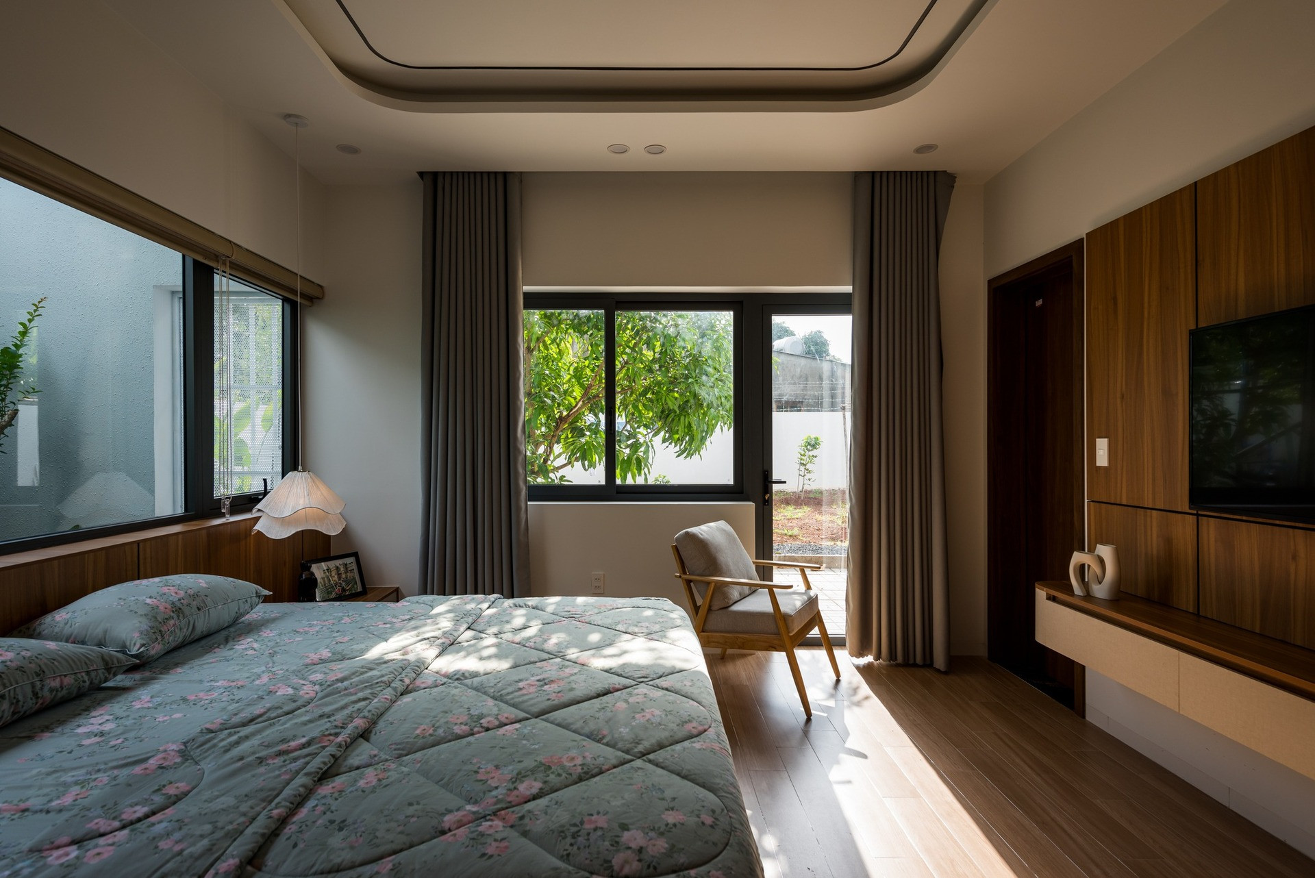 Từ định hướng đó, công trình được tổ chức thành các khối chức năng rõ ràng: khu “động” dành cho sinh hoạt chung và khu “tĩnh” dành cho nghỉ ngơi, giúp không gian vừa thông thoáng, vừa đảm bảo tính riêng tư cần thiết.