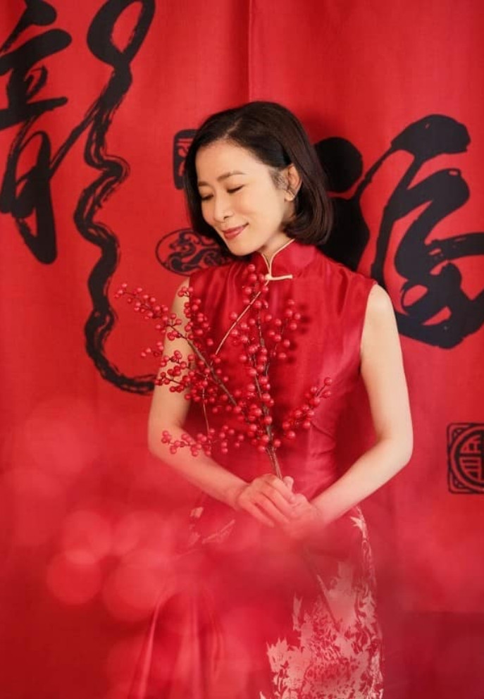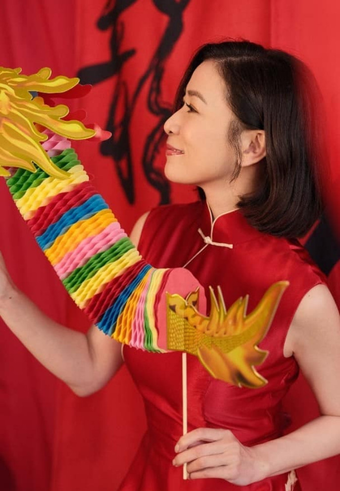 Nữ diễn viên diện trang phục sườn xám truyền thống màu đỏ, tạo dáng chúc Tết bên lồng đèn, mô hình rồng với ngụ ý cát tường, may mắn.