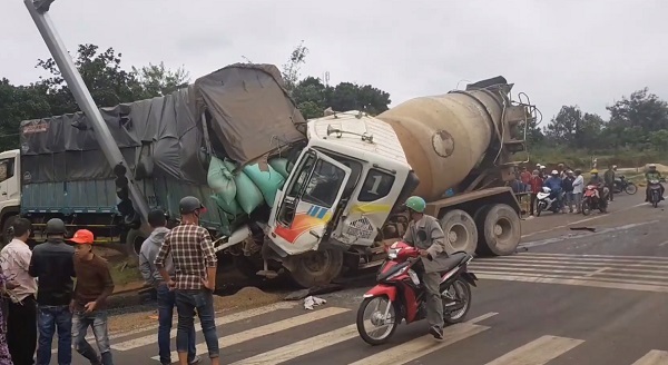 Lúc này, xe bồn trộn bê tông của công ty TNHH xây dựng Phú Xuân BKS 47P-2397 do Nguyễn Ngọc Dũng (SN 1984, trú TP Buôn Ma Thuột) điều khiểu lưu trên đường tránh Tây Buôn Ma Thuột bất ngờ mất thắng tông thẳng vào đuôi xe tải chở cà phê dừng đèn đỏ.