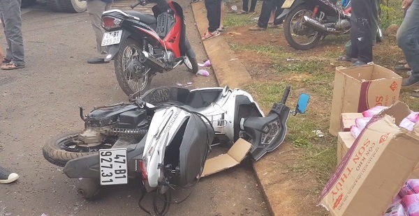 Khi đến khu vực vòng xoay thì dừng đèn đỏ. Trước đầu xe tải, xe máy BKS 47B1-927.31 do Thiều Quang Nhật (SN 1991, trú phường Tân Lợi, TP. Buôn Ma Thuột) điều khiển; xe máy BKS 47L5-2646 do Y DHấp Bkrông (61 tuổi, trú xã Đray Sáp, huyện Krông Ana) điều khiển và xe lôi BKS 47K2-5212 do Chu Văn Đặng (SN 1983, trú xã Hòa Khánh, TP. Buôn Ma Thuột) điều khiển cũng đang dừng đèn đỏ.
