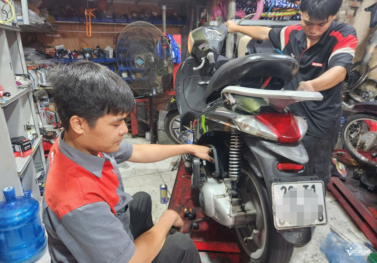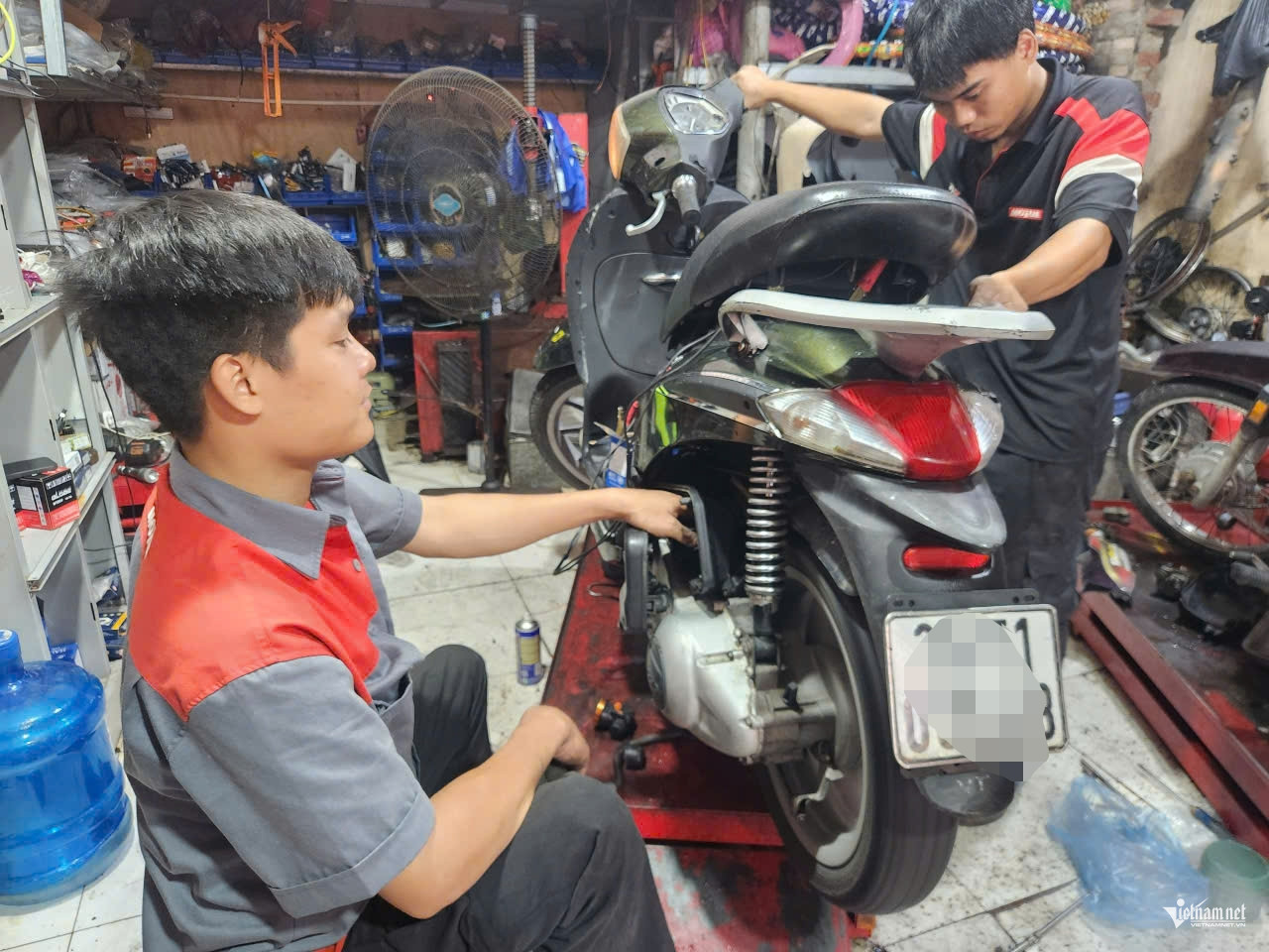 Chị Nguyễn Thị Hòa may mắn hơn khi xe số vẫn có thể xử lý tạm thời trên đường: “May xe số các bác sửa xe lưu động còn hỗ trợ được, chứ xe ga thì hỏng hóc phức tạp, phải dắt hẳn vào tiệm sửa”.