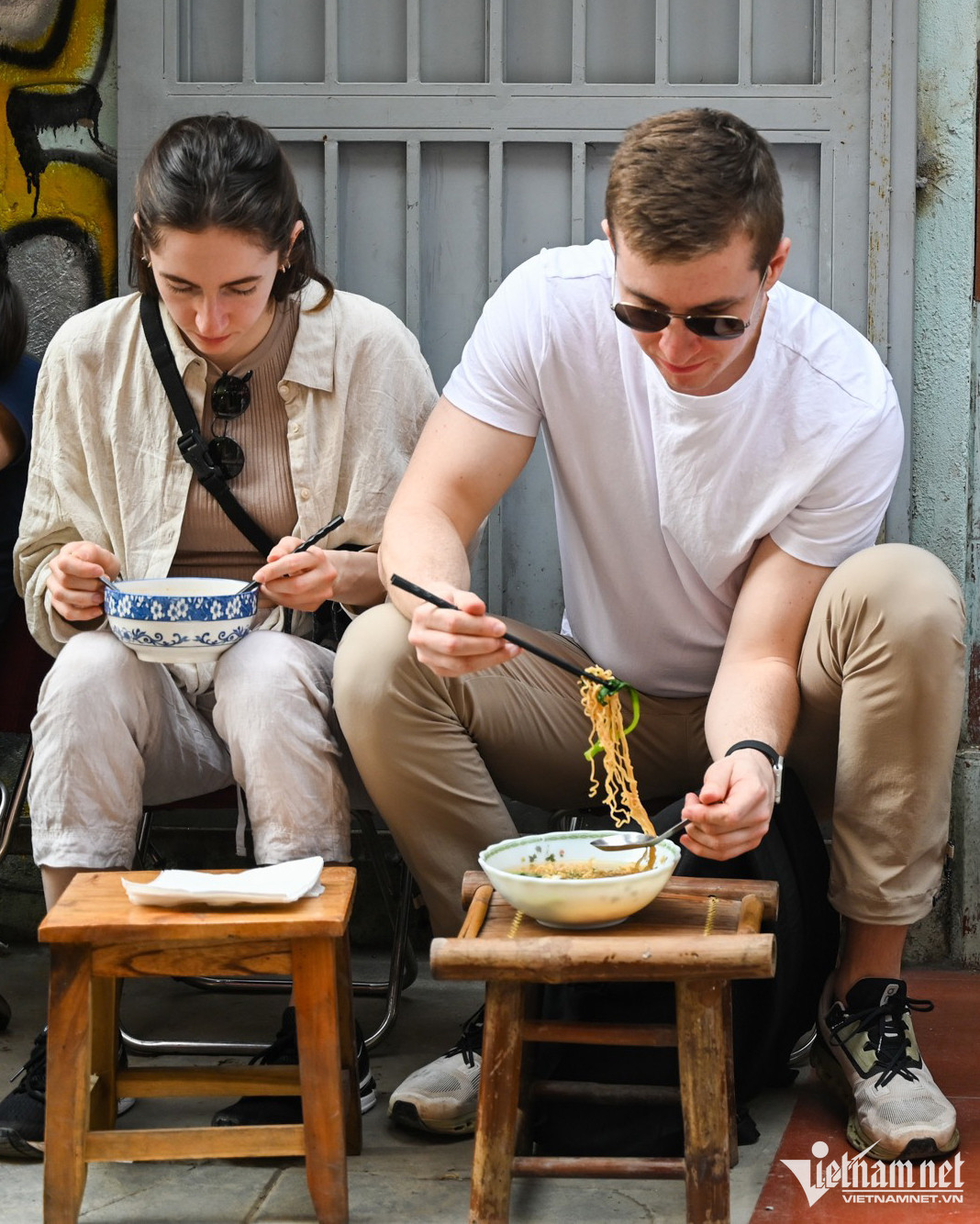Hai du khách đến từ Pháp thích thú thưởng thức mì tôm trong khi ngồi chờ tàu.