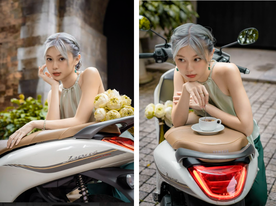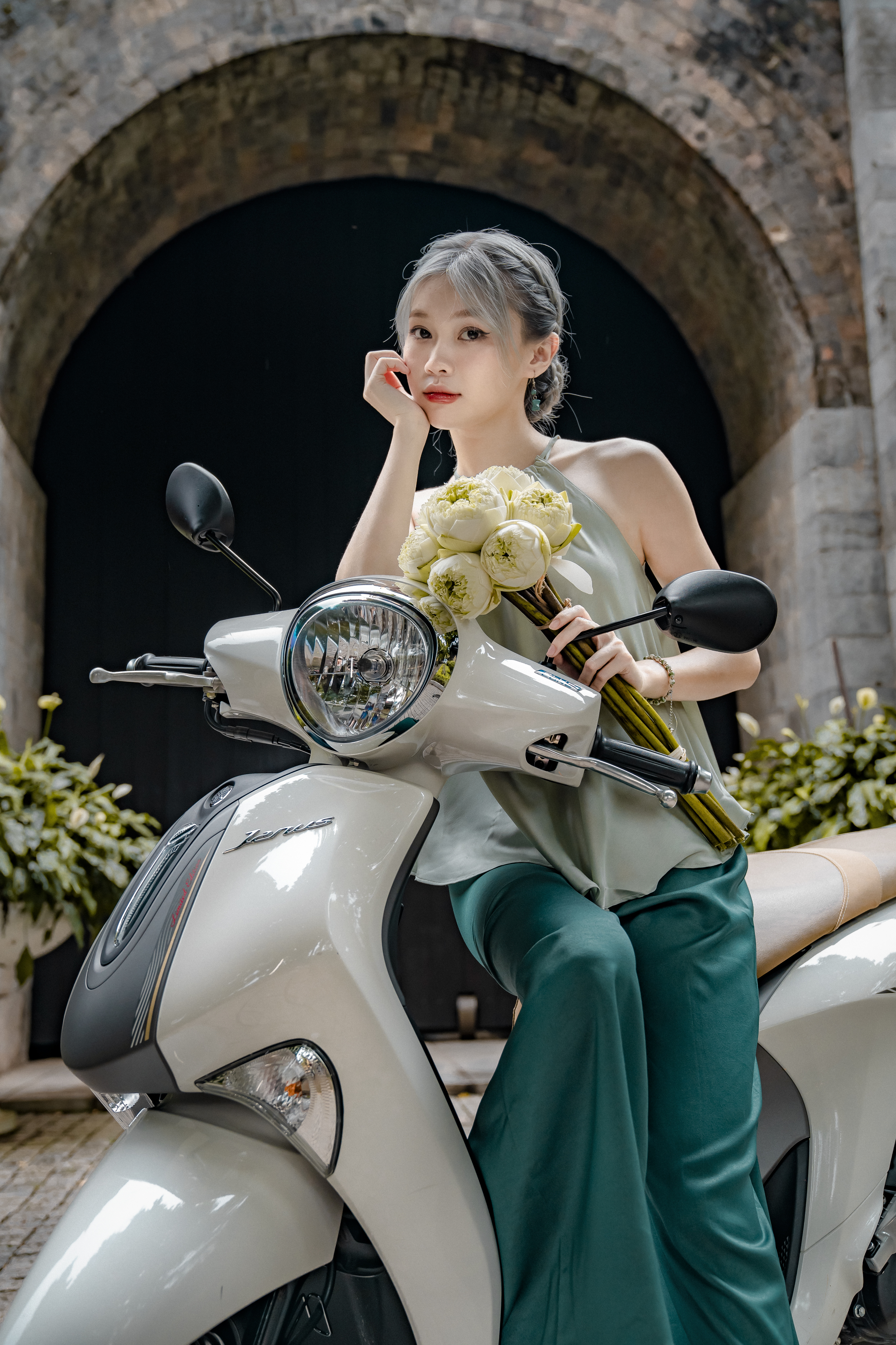Thay vì váy vóc điệu đà như những “nàng thơ” khác, cô đã hóa thân thành người con gái truyền thống trong bộ áo yếm. Bộ ảnh của cô vừa mang nét hoài cổ, lại vừa mang nét hiện đại nhờ người bạn đồng hành Yamaha Janus. Xinh xắn, gọn nhẹ, tiện ích và hiện đại chính là những tính từ mô tả về người bạn này của Ly Phạm.